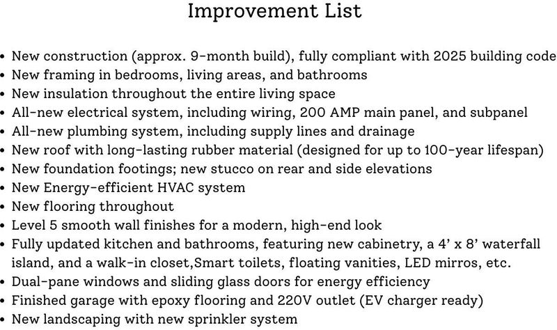 Completely rebuilt like new! Over 700k rebuild cost! This stunning 4-bedroom, 2-bath home was taken down to the studs and rebuilt throughout. Features new framing, insulation, drywall, texture, and finishes. Brand-new slate roof with 100-year lifespan, brand new 200amps electric main panel and sub-panel, brand new electric wires, brand new waterproof vinyl flooring, new doors, and new double-pane windows. Bright open layout with recessed lighting throughout. Modern kitchen with waterfall island, two-tone custom cabinets, and new stainless-steel appliances. Luxury bathrooms with smart toilets. Primary suite includes walk-in closet. Finished garage with epoxy flooring. New energy-efficient HVAC system, new landscaping, and spacious concrete patio in the backyard.