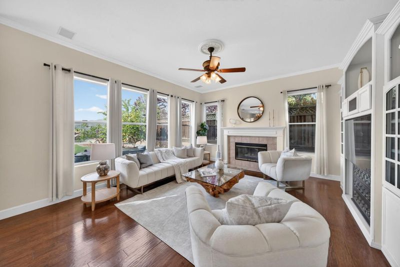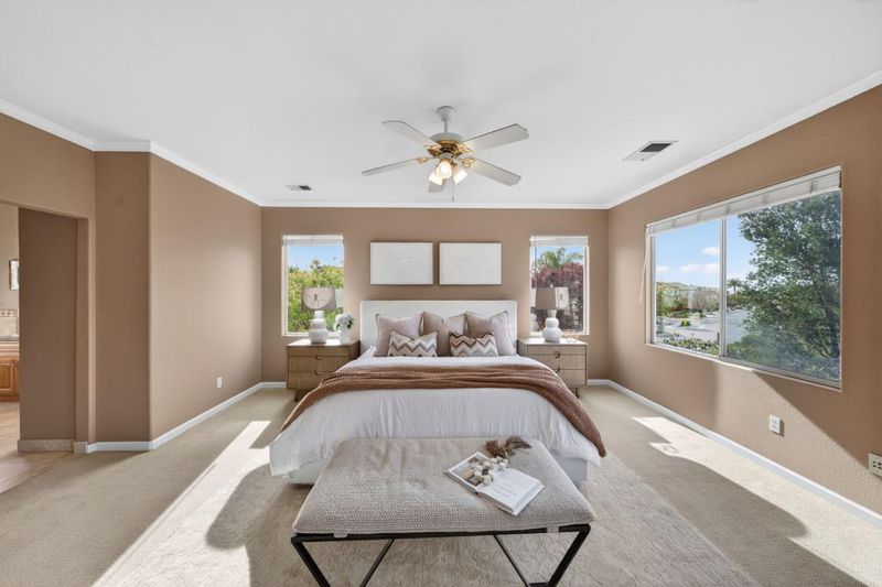Behind the gates of Silver Creek Valley Country Club, this impeccably appointed estate blends elegance, privacy, and sweeping views of mountains, city lights, and vibrant sunsets. Designed for elevated living, the main level offers a private guest suite and a formal executive office. Upstairs, the luxurious primary wing features a serene retreat and a spa-inspired bath. An additional bedroom, a junior suite, and a spacious media or flex room or a 3rd bedroom provide versatility for modern living. The chef's kitchen anchors the home with a slab granite island, premium stainless steel appliances, and ample cabinetry, equally suited to intimate dinners or grand entertaining. Open-concept living spaces create a seamless indoor-outdoor flow. A fully integrated smart home system enables effortless control of lighting, climate, security and audiovisual features. Fully owned Tesla solar with Powerwall backup ensures off-grid resilience. The private backyard showcases a heated pool overlooking protected open space with no rear neighbors, offering tranquility and unobstructed views. Hardwood floors, crown molding, and curated finishes complete this refined residence. Ideally located near Silver Oak Elementary and premier parks, this home embodies the best of California luxury living.