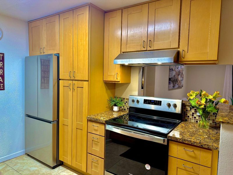 - Countertop - Granite, Dishwasher, Freezer, Garbage Disposal, Microwave, Oven - Electric, Refrigerator