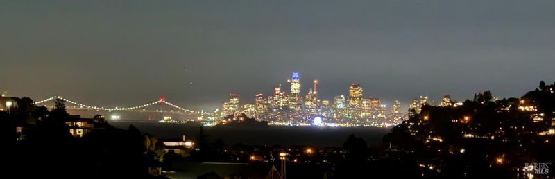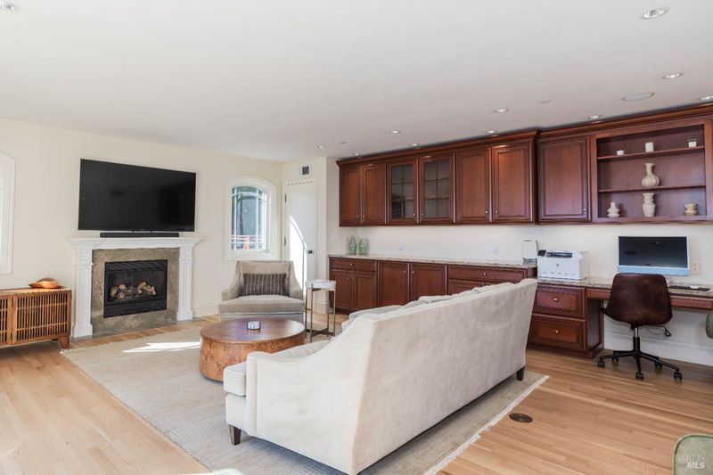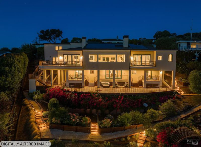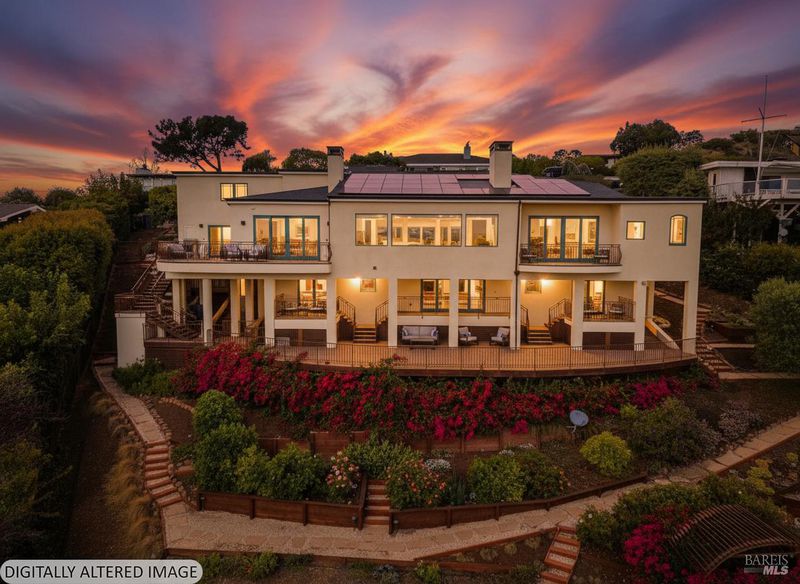 Perched in one of Tiburon's most desirable enclaves, 9 Francisco Vista Court offers sweeping panoramic views of the Golden Gate Bridge, Bay Bridge, Alcatraz, and the San Francisco skyline. Privately situated on a quiet cul-de-sac, this exceptional residence blends scale, comfort, and seamless indoor-outdoor living. Spanning approximately 5,585 sq ft on almost one acre of land, the home features 5 bedrooms and 4 full and 2 half baths across a thoughtfully designed multi-level layout. The main level includes the primary suite, office or nursery, formal living and dining rooms, chef's kitchen, family room, separate prep kitchen and laundry. The primary suite offers high ceilings, a private balcony, electric fireplace, spa-like bath with freestanding tub and walk-in shower, and a large walk-in closet with center island. The chef's kitchen opens to wraparound patios and view decks, creating an ideal setting for entertaining. The upper level features a 3-car garage with water views, a bedroom, full bath, and a dumbwaiter to the kitchen. The lower level includes two to three bedrooms (one en suite), an additional full bath, music and wine room, private theater room with 8k television and surround sound, expansive deck, utility room, and abundant storage. Additional highlights include extensive solar panels, generator backup system, and commercial-grade heating and cooling systems. Ideally located near Tiburon's waterfront, dining, and recreation. Amenities include panoramic Bay and skyline views; a luxurious primary suite with balcony, fireplace, spa bath, and custom walk-in closet; office or nursery adjacent to the primary; formal living and dining rooms; family room off the kitchen; a chef's kitchen with Sub-Zero refrigerator, Wolf 6-burner range with griddle and double ovens, two Fisher & Paykel dishwashers, KitchenAid trash compactor, Viking warming drawer, Zephyr wine cooler, additional refrigerator drawers, GE convection oven and microwave, and prep pantry with sink and third dishwasher; fireplace pizza oven combo; gas-start wood-burning and electric fireplaces; main-level laundry with Bosch washer and dryer; lower level with two en suite bedrooms, family room, and large deck; private theater/media room; extensive storage and utility spaces; dumbwaiter; 3-car garage with water views plus garage-level bedroom and full bath; extensive solar panels, generator backup; commercial-grade HVAC; and multiple outdoor decks with landscaped grounds.
