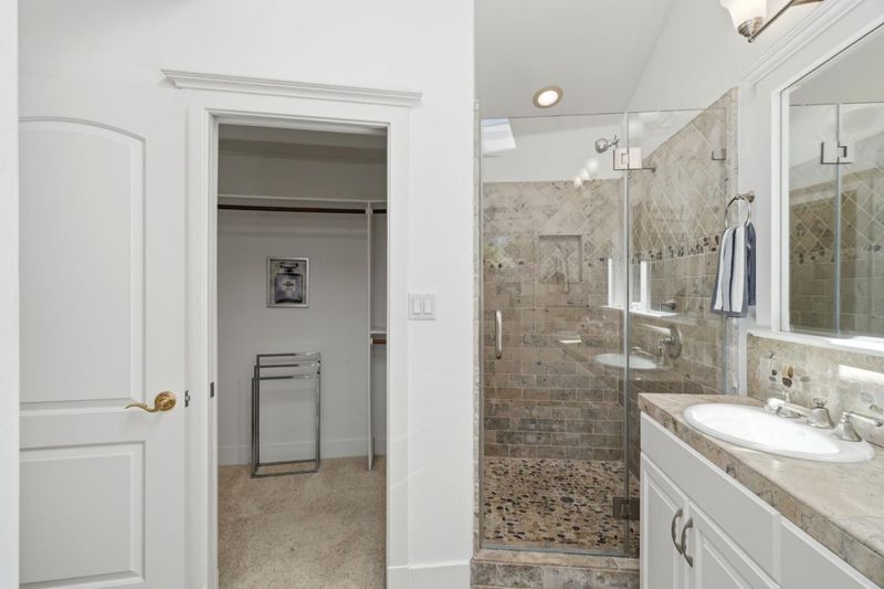 - Double Sinks, Full on Ground Floor, Half on Ground Floor, Marble, Outside Access, Primary - Stall Shower(s), Shower over Tub - 1, Skylight, Updated Bath