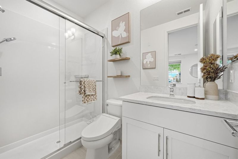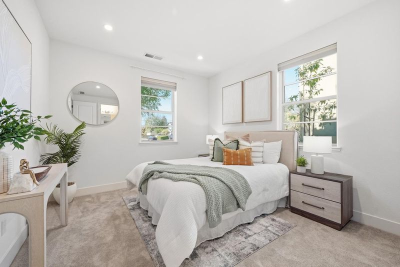 Welcome to this beautiful 2024-built end-unit townhome with 4 beds and 3.5 baths in convenient Mountain View. The home greets you with a cozy gated front yard. A ground-level suite with a bedroom and a full bath featuring a stall shower offers great flexibility for guests or extended family. The second level features an open floor plan with a spacious living room filled with natural light from large windows, flowing seamlessly into the dining area and a modern gourmet kitchen with an island, stylish countertops, a beautiful backsplash, stainless steel appliances, and ample cabinetry. There is a door to a private balcony for relaxation. A half bathroom is conveniently located nearby. The third floor hosts the primary suite with a spacious bedroom, a walk-in closet, and a modern en-suite bath with a double vanity and a stall shower. Two additional bedrooms share a full bathroom with a double vanity and a shower over tub. A washer and dryer on the same level add everyday convenience. Enjoy a prime location near restaurants and grocery stores, including Costco and Safeway, just minutes from Google and Microsoft, with easy access to Hwy 101 and 85 for a short commute to major tech companies. Zoned for top-rated Los Altos High School. Do not miss this great opportunity!